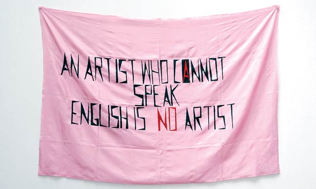 The artist’s books are means of deliberation on a couple of issues, including language and money. Apart from his statement-based works where he employs clearly articulated ideas to become a material for the work, Stilinovic’s books remain largely abstract. Books such as 00000 or=0 are visually and content-wise very minimalistic. Without any prior knowledge on the artist or his ideas on art and money it would be almost impossible to decipher these books and interpret 0 as the symbol for value or non-value. I would argue the same principle or frame of reading applies to his books that employ language and different translations of words. Without reading his statement—an artist who cannot speak English is no artist—the words would remain as scribblings on a piece of paper, merely a sketch.