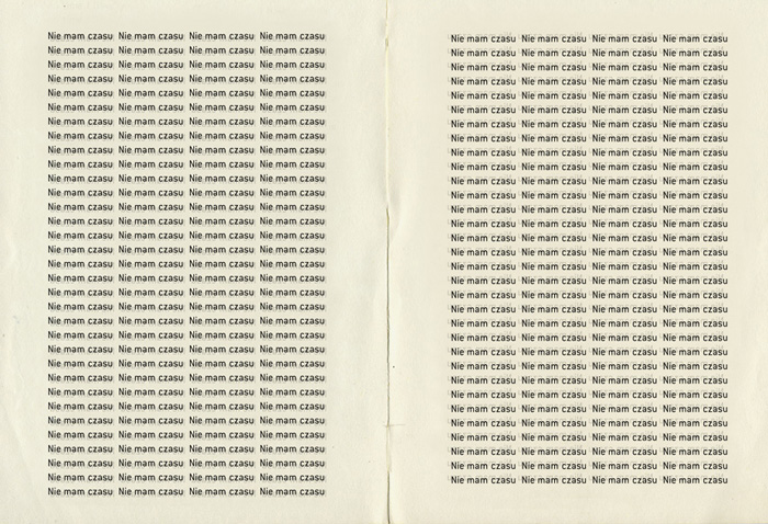 I want to pick on the issue of language. Many of Stilinovic’s books use language, words and pulp. This creates a language barrier between Stilinovic and the viewers, which I most welcome. The inability to comprehend the scattered words and phrases in the books pushed me (and I’m projecting on other viewers here) to deduce some sort of meaning from the exhibition that was outside of any language. Trying to refrain from exoticizing the foreign language, I had to be creative in “reading” this work. While the resources available in the gallery space, ranging from interviews with the artist to close readings of the work, provide a background on which the works can be viewed, I did not find this necessary. Seeing the “wall text” that repeats “I have no time” written in pencil, Stilinovic was already speaking or pretending to speak my language and we were accomplices from that point on.