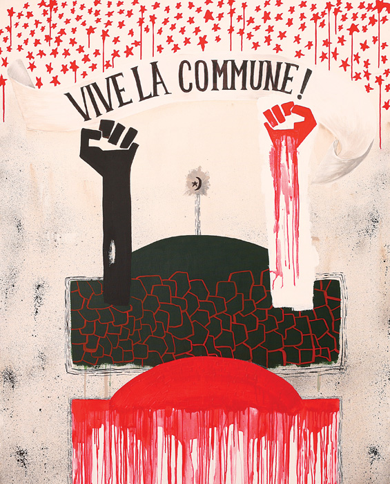 Ülkenciler, who uses many different materials together in her artworks, created these works using a mixed technique, which also contains certain elements of poster aesthetics. Her works herald us a sky painted in black and red. This can also be interpreted as an invitation for color symbolism or for a rebellion that will be carried out under a Red & Black flag. The artist points out that, concrete and perceivable class struggles still persist in our age and she brings a slogan from the past to our current day: Vive La Commune!