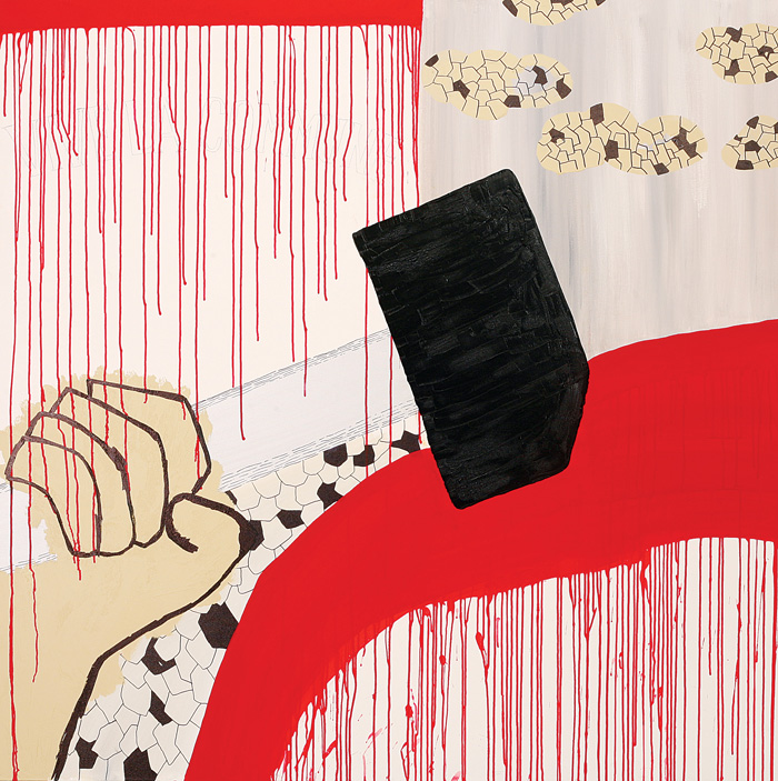 I’m authoring this introduction with the first impressions I got from the indicators that can be observed in Olgu Ülkenciler’s latest series of artworks titled “Das Fenomen.” First and foremost, these works contain a reality full of socialist symbolism and constructivist references. These references contain elements displaying the existence of social classes despite the claims made by the “so called” socialists, reformists and Marxist gourmets that there are no such classes anymore. The fact the hands of the working class as well as the black stars symbolizing youth, army, workers, farmers and intellectuals can be seen in all these artworks, encourages us to examine the current status of the proletariat. Despite the New Middle Class academicians and intellectuals, who claim that social classes no longer exist, Ülkenciler shows us that the class struggle is not over but that the method of the struggle must undergo a change in accordance with the changing state of affairs.