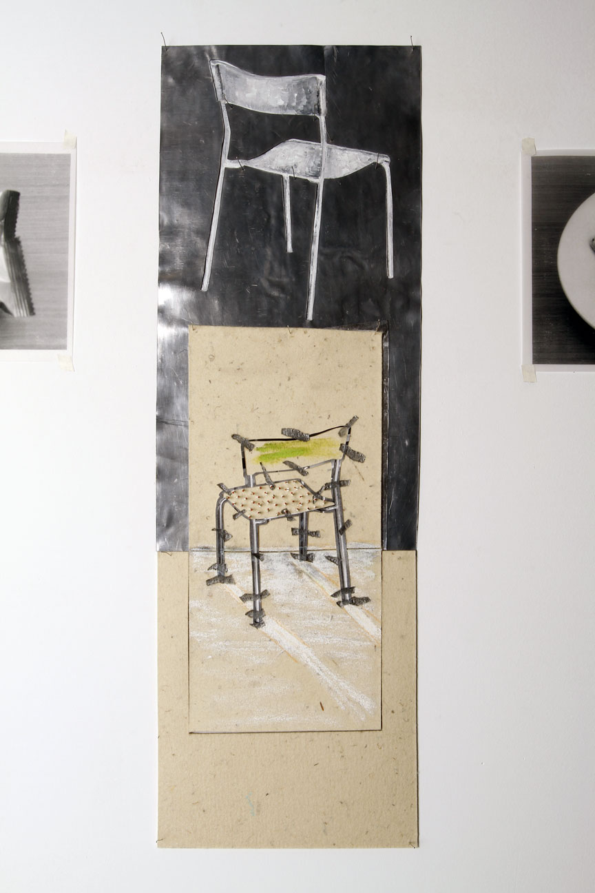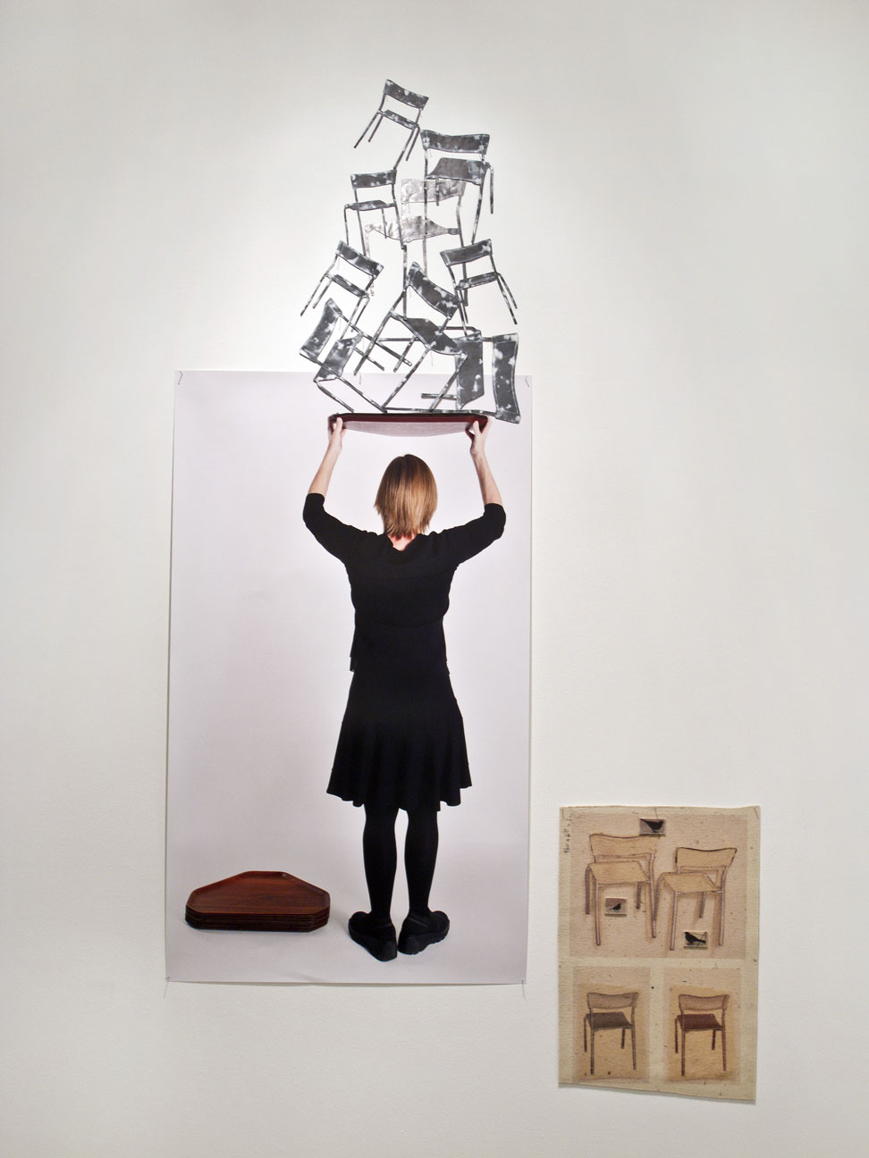 Located in the center of the sprawling university campus, the dining hall is the focus of the works presented by Criswell in this exhibition. With its extensive scientific and social infrastructure, the campus resembles a satellite city, which can become claustrophobic and isolating after long periods of time spent there. It seems that for the artist, the feeling of estrangement makes itself most evident in the dining hall. The experience of eating becomes a test for Criswell where everything is multiple choice; hundreds of people sit and eat on mass produced chairs, around mass produced tables with mass produced utensils, whose clinking mix into the undecipherable conversations echoing under the tall dome of the dining hall. Photographs documenting this atmospheric struggle of consumption are taped to the exhibition walls. The images of empty tables, partnered blue and orange chairs, black and white photos of fruit and breakfast plates generate a certain rhythm in the exhibition space. These personal interventions of the artist introduced by her own movements and flow disrupt the rhythm created by the emphasis on mechanization and repetition in the photos.