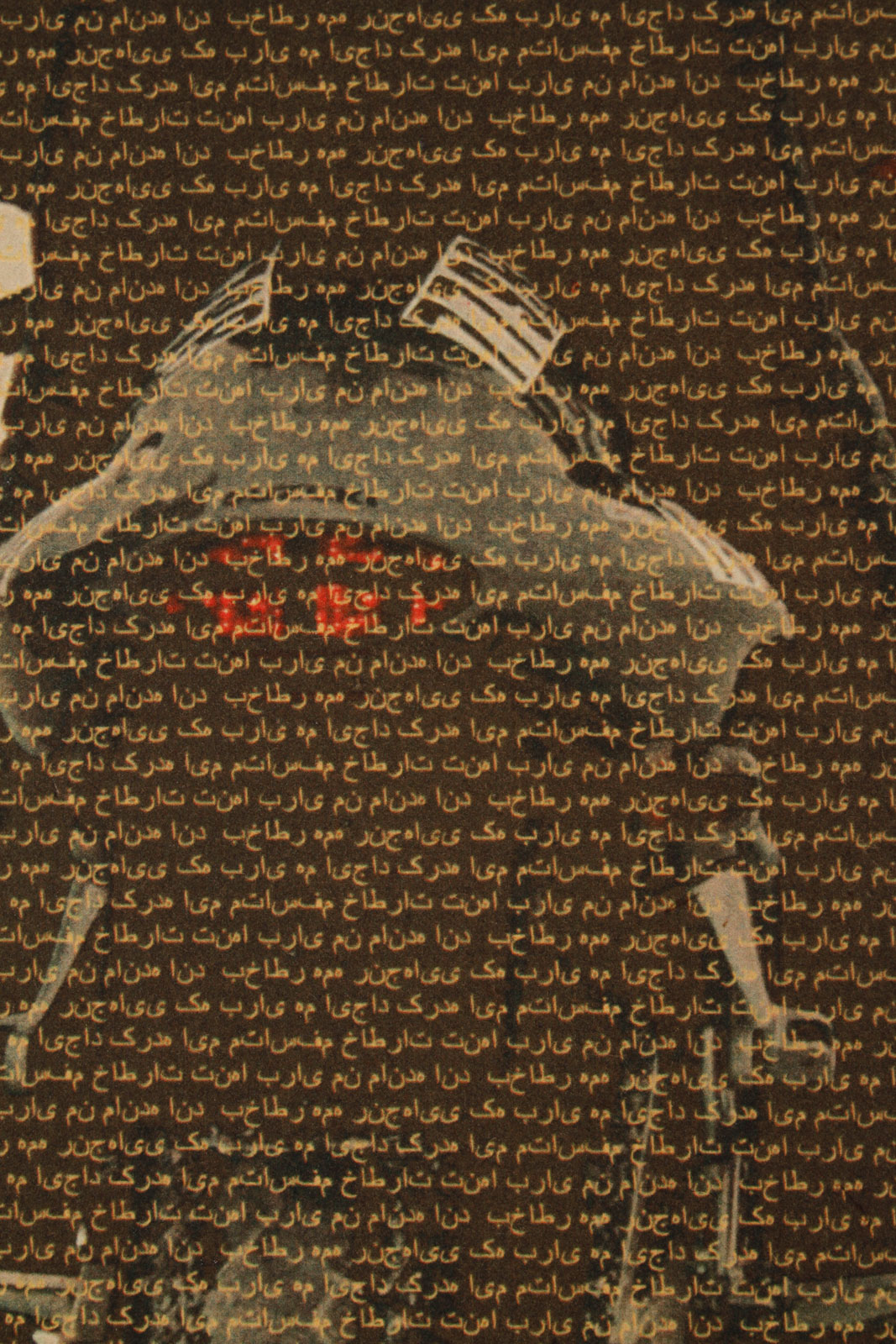 Other works of Michael Bishop are featured in the first section of the exhibition space accompanying the boxing gloves. Three large photos printed on industrial felt are hung on the three walls that make up this section. The first one “Hot Code, Stuxnet” is a photo taken from a hotel window where the artist stayed during a visit to Izmir. In the photo, there is a ship moored to a work platform equipped with a crane in the middle of the harbor. The ship, crane and iron pier scaffolding appear as one, while from afar, where the artist takes the photo, it appears as a dove struck by arrows or a sea monster. Over this image, as a foreground, a computer code appears in white letters. The code is a malware called Stuxnet purportedly implemented by the CIA and MOSAD to hack and collapse crucial computer components in the uranium enrichment infrastructure in Iran. The other two photos in the first room, “Slammed English” and “Slammed Farsi” are duplicate images of a Hot Rod, modified cars that were highly popular as an “outlaw” image in the 1940’s and ‘50’s, in California . The exposed engine of the metallic car’s body is highly modified for illegal street racing and is dynamically close to the ground. For the ignorant eye, it might look like a car in repair, merely an antique without much meaning, however, for people who are familiar with a certain period in U.S. history (the movie American Graffiti is a popular view of this James Dean phenomenon) it has nostalgic significance. This car representing the local and personal is photographed against the white background of the vast Great Salt Lake in the west-central U.S.A. A text in yellow letters over the image states: “I Am Sorry For the Pain We Have Caused One Another The Memories Are Now Mine Alone”. On the wall opposite, appearing as the second half of a diptych is “Slammed Farsi” where the repeated text appears in Persian.