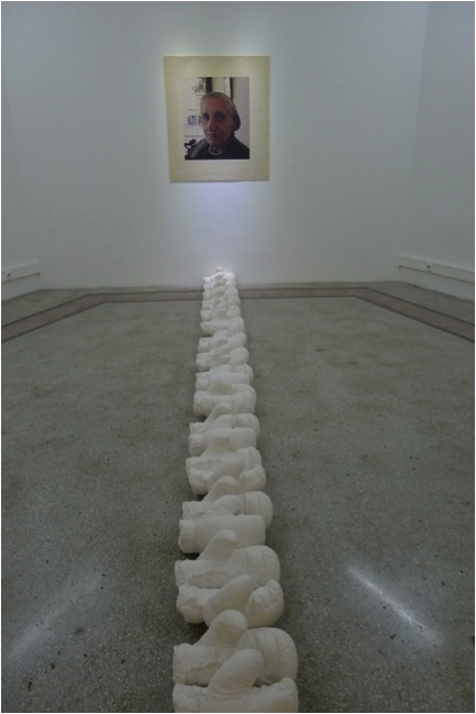 The exhibition is composed of works produced during the artists’ 2010–11 Visiting Scholars residency at Sabanci University. Descending the stairway to the vault of the Minerva Han, one of many historic bank buildings lining Bankalar Caddesi in Istanbul, the viewer must then enter through a heavy vault doorway, always ajar nowadays, to the KASA exhibition space. Once inside, the viewer is confronted with “Necile & Ali: The Calendar,” a line of 108 white plaster boxing gloves aligned on the floor, form the spine of three consecutive sections of exhibition space. At the end of the line of gloves, each looking like a hugging couple, a portrait of an indigenous looking woman catches the viewer’s eye.