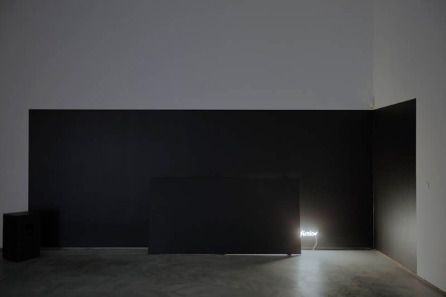 The room to the left, Science Fiction_3114, is a more sophisticated manifestation of the idea of architectural disruption; the sound from the few speakers on the floor — derived from science-fiction films such as Alphaville and Fahrenheit 451 — trigger an ominous suspension of disbelief, similar to the experience of reading Ursula K. Le Guin’s The Dispossessed (1974) marked by the eerie, the subtle and the self-reflective. The added leaning wall partially obstructs the neon sign “science fiction”—the word “science” is not visible. The floor creaks; the dissolution between the muted experience of this room and the very gallery space that the installation is in is the exhibition’s tour de force.