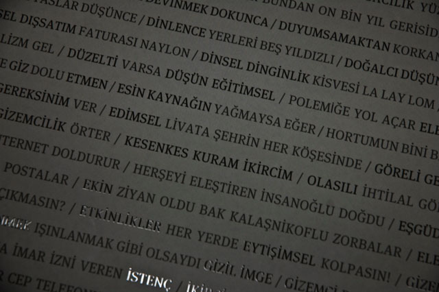 Özge: I see a similar concern in your work 191/205 (2009). For this project, you found 191 of the 205 words banned by the Turkish Radio and Television Corporation in 1985—including “memory”, “freedom”, and “equality”—and transformed them into a rap song, in collaboration with Fuat Ergin. You thereby channeled banned words into a popular medium. In other words, you reversed the condition of interdiction and forgetting by deciding to speak loudly about it. Can we say that you wanted to normalize the perception of these issues?