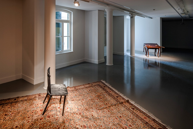 “The Missing Cuckoo” is an installationbased work that presents a plan of escape and departure, in contrast to “Terki Dünya”. An action is described in the hanging handkerchief—one that might have been accomplished, or that is being planned for the future—while the closed door of the cuckoo clock produces a tension between the way in and the way out, giving rise to doubts as to whether there is any way to permeate this “interior”. The cuckoo, the protagonist of the story told by a single object, is also missing. It may exist both behind the closed door and outside in our realm somewhere, or it might never have existed. The writing, erasure, and rewriting of sociopolitical histories can be traced through the cuckoo that might or might not be there. The invisibility of the cuckoo relates to the claustrophobia encapsulated in “Terki Dünya”, a kind of sealedoff isolation that is palpable, yet nonconfrontational.