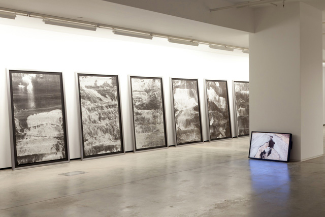 The series eponymous with the exhibition, Black Album, was formed by the spreading and freezing of metallic silver paint applied to tarred felt. Avşar says that he was inspired by his night time journeys to the east, in particular to the snow-covered mountains. When he was on the road, images would flow by and this is related to movement and speed (we could again think about the relationship to TV and cinema here.) This “fluid” situation in the Black Album invokes memories of all mass movements, under the specific characteristic of the Gezi Park resistance. Because it counters a situation which is fluid, restless, which seeps through the holes it finds, cascades thick and quickly from time to time, and just keeps on going. The heap of energy that accumulates somewhere, ready to explode, the impossibility of controlling social upheaval when it flows into the streets and the affinity between the artist’s application of a bucket of metallic paint onto the felt with the built-up tension, could be interpreted as Avşar’s expression of social transformations that he has witnessed over time. The coincidentality, spontaneity, self-formation and incontrollability of the affairs invokes memories of Gezi Park resistance, uprisings in the Middle East, and endeavors of the Rojovan Kurds to form a state.