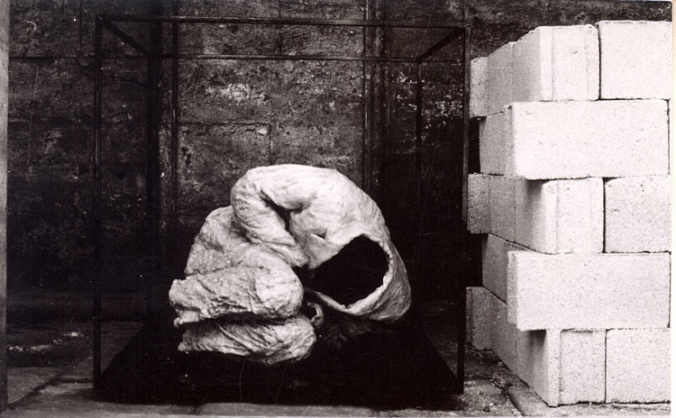 Let’s get to Cengiz’s work. The title is: Embryo/Crust – Resistance/Energy. It is an art work. In a cube formed by iron rods, a person made of polyster is placed in the embryonic position. The person’s position is revealed to us through the clothes; the polyster cast is empty inside. Right next to it is a tomb, constructed from one meter-long briquets. The floor of the tomb is made of soil, and through the soil, a resistance line passes—when electricity is provided, the resistance becomes red.