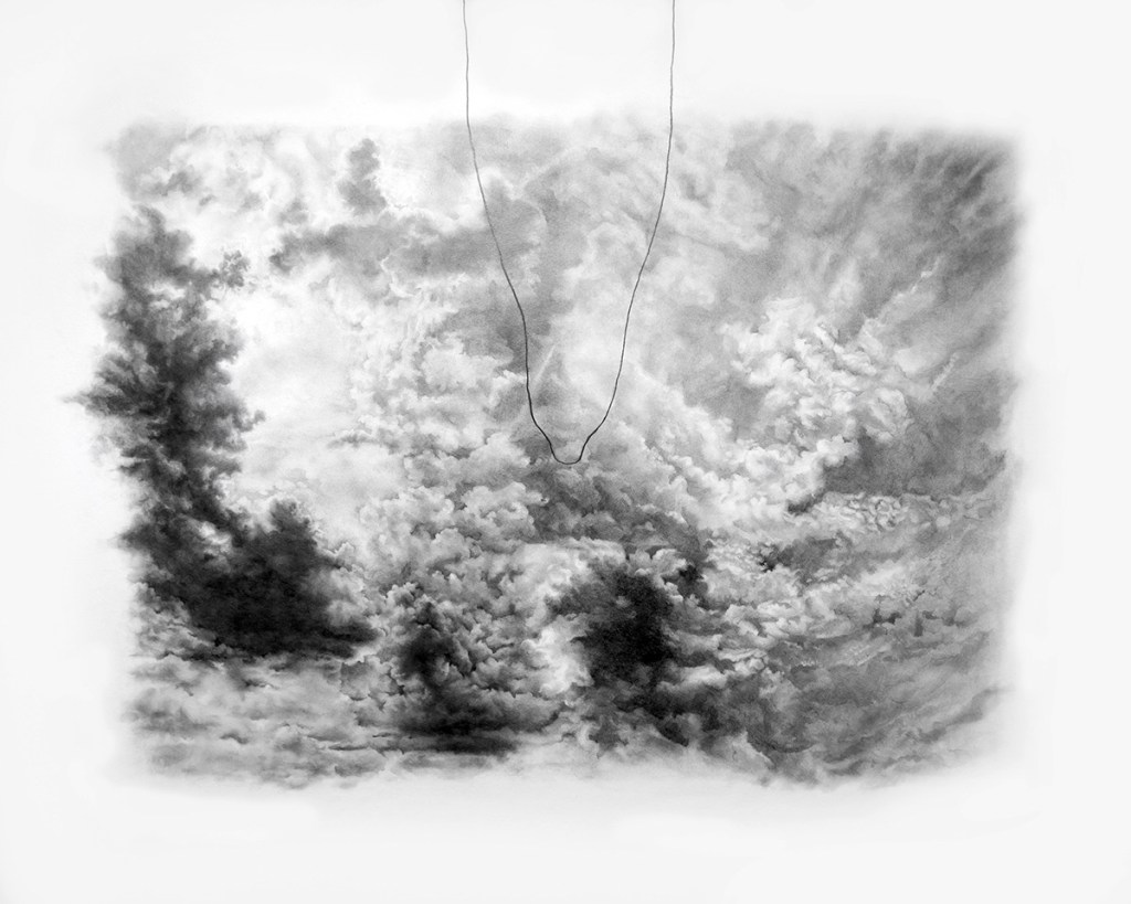 Burcu Yağcıoğlu: When I started working on that drawing, I decided to add a form on top of the clouds that would both erect and dangle at the same time. Almost everybody who saw the work read the form as a phallus though, despite the fact that it also dangles from above. It could easily also have been seen as a dangling boob, a sack or a massive sock I thought, but instead I’ve seen a clear tendency for the form to be read as an erect phallus. I think this tendency itself indicates the symbolic order and phallocentrism. I didn’t think of the drawing in these words when I was making it though. I was interested in drawing a form that is not coherent with the rest of the drawing. Descriptions of sky in the case of heavy rains and floods within languages and myths was my initial point of this work; such as the sky falling to the ground [gök yere indi] or the sky split open [gök yarıldı]. But when the show opened, that form reaching above the skies manifested itself to viewers as a presumptuous phallus. It was quite interesting that viewers were curious about what that form actually is; how it works with the rest of the drawing; why it is there… I liked this questioning; this demand for an explanation. I didn’t want that form to collaborate with the detailed and realistic elements of the drawing. I wished it to act almost as a party pooper. I don’t think that I could have found enough motivation to go through with the exertion of making that drawing, if it weren’t for that form.