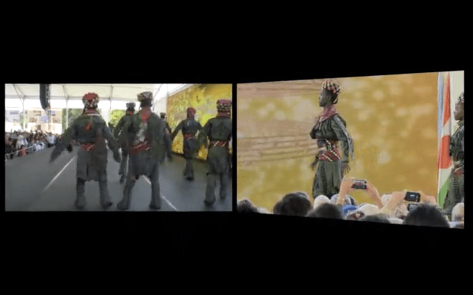 In Young Turks, I chose to work with two synchronized cameras and later to show them as a two-channel synchronized video. My camera was recording the audience’s reactions when they’re watching the performance on stage, documented by another camera on a tripod. There was a moment when the presenter on the stage said, “We are so grateful to you because you sent your sons from all over Anatolia to Africa.” This is precisely where I wanted to see how people had silent tears in their eyes—this is the detail I’m looking for. And to be able to represent this moment to the audience I needed to show them both the action and the reaction, at the same time.