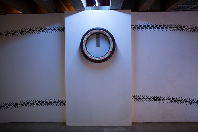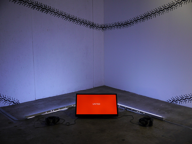 “THE LIARS UNITED WILL NEVER BE DEFEATED.” These words on the red computer screen create an immediate affiliation of a clear message that simultaneously unites and divides. Who are the Liars United, do we know them, do they surround us, and how can we be sure that they will never be defeated? What if they are defeated, what happens then? This statement is indeed the result of Fraser Stewart’s imagination. Creating an installation that revolves on making an identity for “The Liars United”, Stewart invites us to stop and think about “The Liars”. Are they imaginary, or completely real? Surrounded by tires and their marks on the white walls of the Corridor Project Space that cross the entirety of the exhibition space, the marks remind us of the skid marks in conjunction with accidents and the sudden stops.