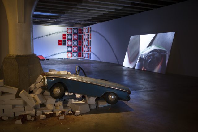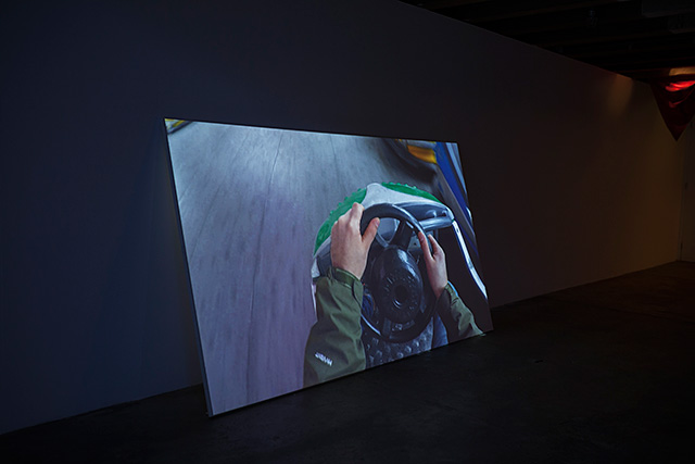 In Demirci’s video POV (2017) we see the world through the artist’s eyes (or the POV camera) as he is enjoying a bumper car drive in an amusement park: driving, crashing, and continuing to drive. No one’s hurt, no one complains, no injuries, no death toll. In short: no repercussions. Presented in a constant loop, the video is projected on a surface that is leaning against the wall, neither completely hung on the wall nor laying on the floor. This in-between placement of the video imitates the act of the assimilated form of driving which is the subject of the video—the safe zone of the in-betweenness of driving a bumper car, driving but knowing that you will really never crash leading to an in-between reality.
