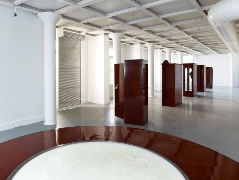 The complex structure here needs explanation. 5 Person Bufet, B.İ.M.A.B.K.R., and Loyelow is a series of successive productions. In 5 Person Bufet, voices are locked inside pieces of furniture through generic titles such as E1 (Man 1), K1 (Woman 1). These cabinets are one person rooms, out of which the voices apply forces of two kinds: force of sound in between the subjects, and physical force each subject applies against the furniture in a desire to break out. The bodies that echo these voices are a coffin, a safe, a vitrine, a door and a prison window cage. These objects-as-bodies are familiar to us through a common/a daily exposure of shared memory. Subjects of 5PB behold such bodies at an in-between; subjects are seeming units of transition that cannot break out of their cabinets nor break free from a totality veiled by the collective unconscious and memory; they are stuck in the symbolism of E1, K1., incapable of dissociating from the cacophony of voices hitting the furniture and thus resonating in a mixture of sounds. This ‘in between’ status does not yet correspond to a full selfhood. Likewise, this undissociated character is the first thing that jumps out at any person who steps into the 4th floor of Arter during July 2011. Although their sizes vary between 5 to10cm. from one and other, in their rosewood coated wooden bodies, the pieces of furniture appear at first sight aligned like soldiers. This is a homogenous structure. These bodies settle into space by wriggling out of the text’s voices however they do not reveal distinctively. Emre Baykal defines this in-between state as follows: “5 Person Bufet creates a space of experience where the claustrophobia of introvert, small spaces coexists with the agoraphobia of getting out, of overflowing oneself” and an “inside and outside, which seem incapable of defeating each other.” The furniture’s interiors are empty, their doors half-open. They do not build a home but create an inward openness within the space.