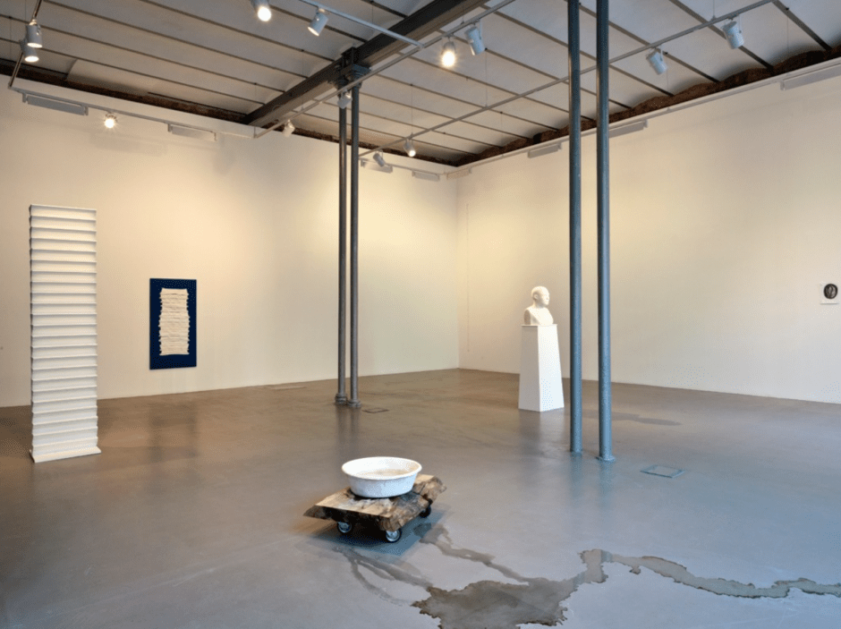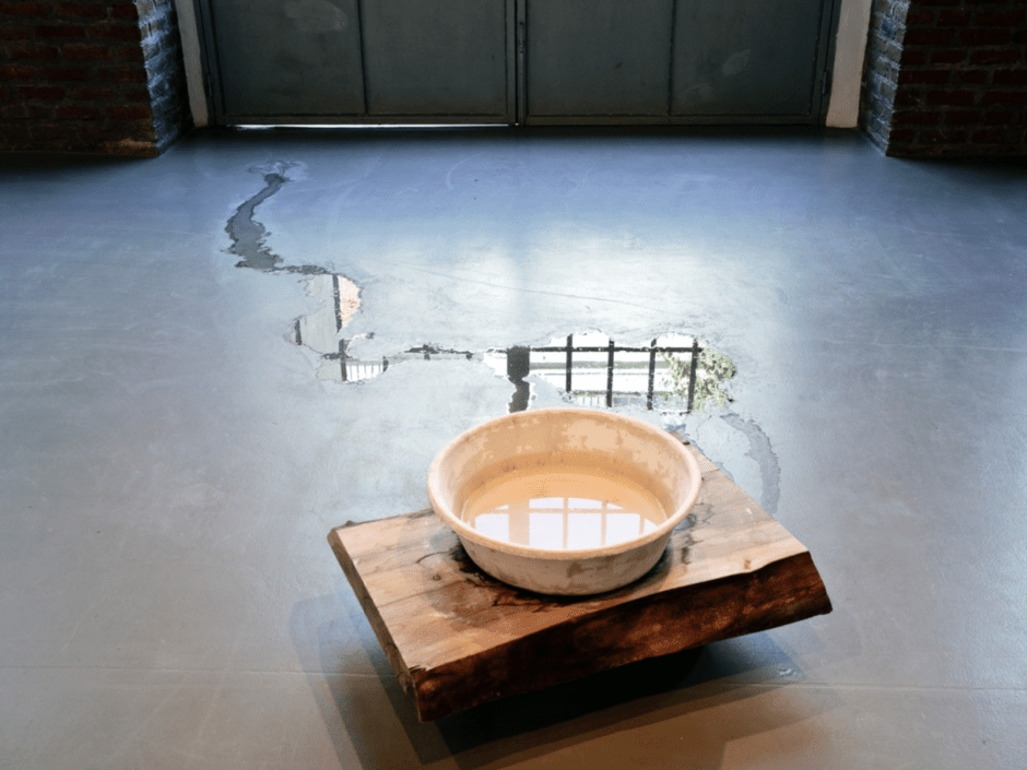 The water in which the plaster-cast bucket fails to hold punctures the bottom of the bucket and starts leaking into the space. As the water detteritorize the plaster plane, the bucket’s process of becoming a bucket begins. It loses its function. Here, the object becomes shaped by the virtual presence of our memory of a bucket; it’s a puncture in the object-hood of a bucket. The object becomes fluid. It leaks out of its known meaning into meaninglessness. (Leak, 2013)