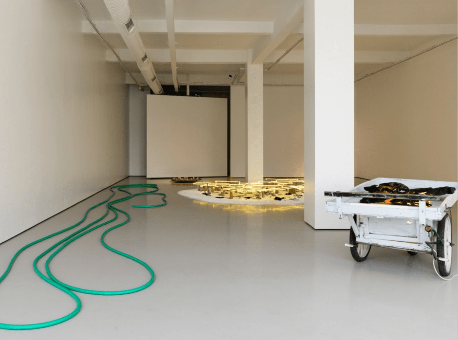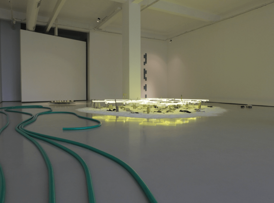 The objects of Loyelow do not present homogeneity in material or appearance like they do in 5PB and B.İ.M.A.B.K.R. The whiteness of the space in B.İ.M.A.B.K.R.’s first instalment, or the alignment, or the texture of the furniture in 5 Person Bufet, or evocations of memory such as white collars of the ruling class or the smell of boiling milk do not melt in the same pot. When one enters the space, the objects appear in vertical and horizontal axis that direct the eye from here to there. Measured from the ground, the hose is at 5 cm height, the neon lights are at 25 cm, the toy car at 10 cm, the tray at 15 cm, the sink at 70cm. The irregular winding of the hose oversees the depth of the space where as the tiles -as a reduced matrix- observe the verticality of the space. Together they form the spatial axis.