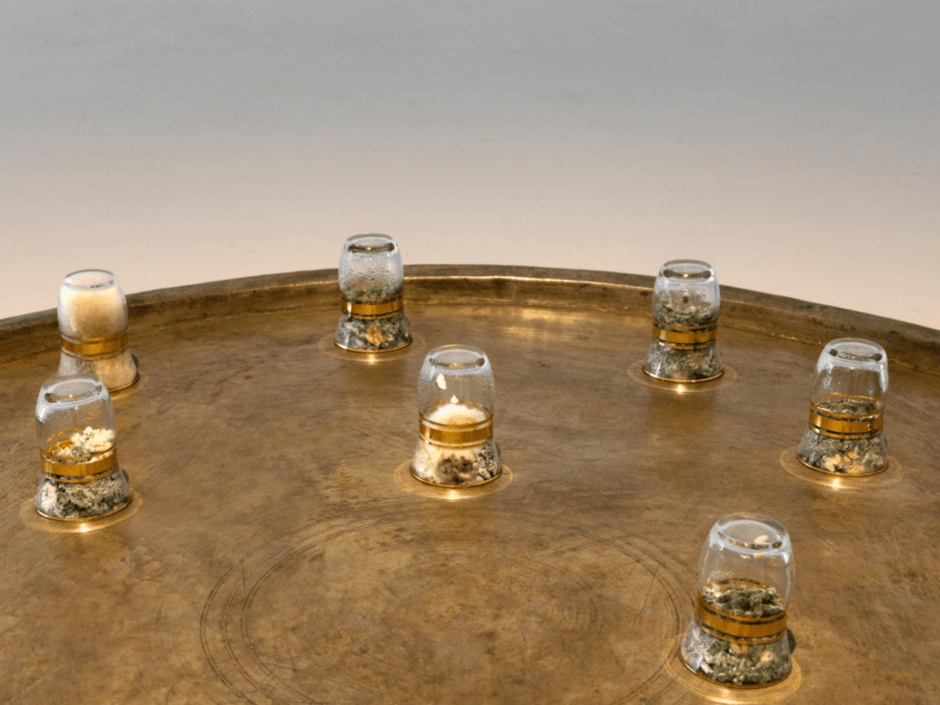 Tea glasses filled with cooked rice each create a different cosmos by sweating on their own territory. We forget about the rice and we forget about the tea. The object takes on an amorphic, unfamiliar appearance. We are not able to recognize rice anymore, it becomes moldy. The tea glass attains selfhood through merging with rice. The tea glass sweats and becomes altered. In every detail begins the object’s self-determination, self-formation process. (Ku, 2016)