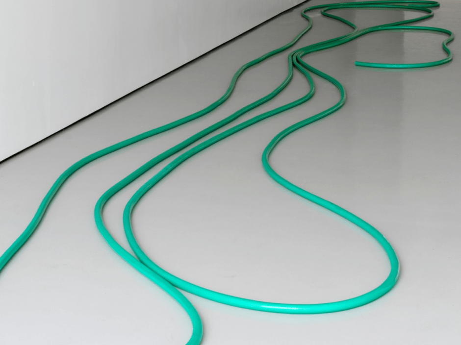 In this sense, the Young Prophet (2016) does this in reverse, through seizing its own becoming. Our memory calls the function of a hose to shape the flow of water. In the gallery space, it lies on the ground, filled with plaster. On close inspection, no intervention can be discerned. However, this is not just any hose, it is a hose and it is certainly not a representation of a hose. It evokes an intuition. What’s visible is the cross-sections of plaster at the two ends of the hose, and to see them, one has to stoop down. When one stoops down, there is a whole other dimension to observe the space. From Loyelow Fields to Ku to Cosmic Blue, Loyelow’s body is seen in a different scale. The presence of objects is disentangled from the gaze of subjects staring down, it is perceived in their own space-time.