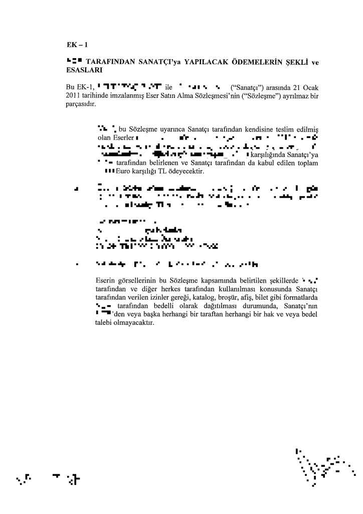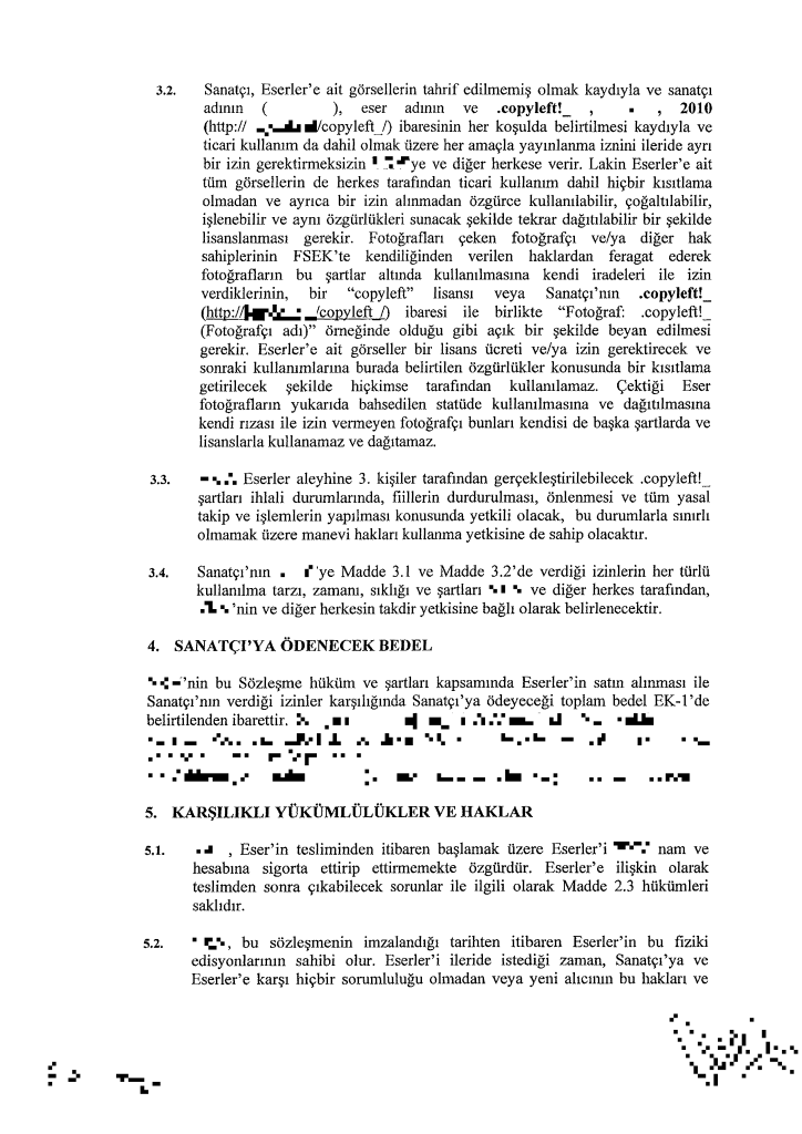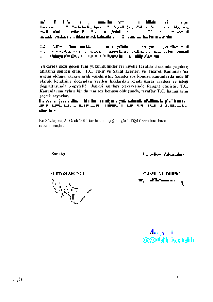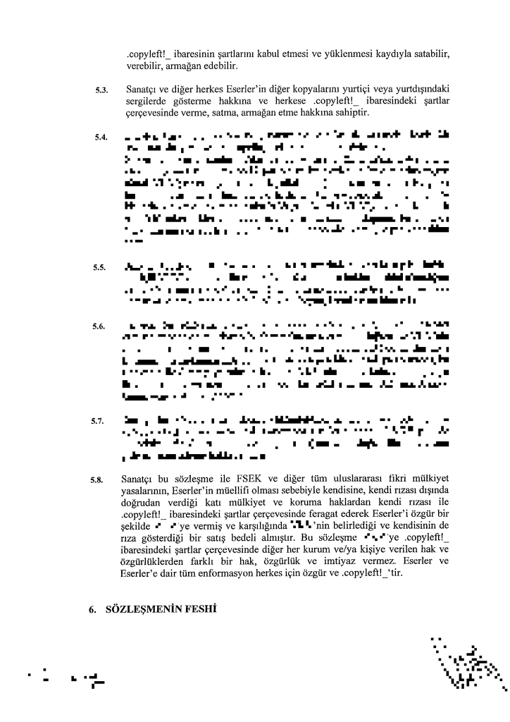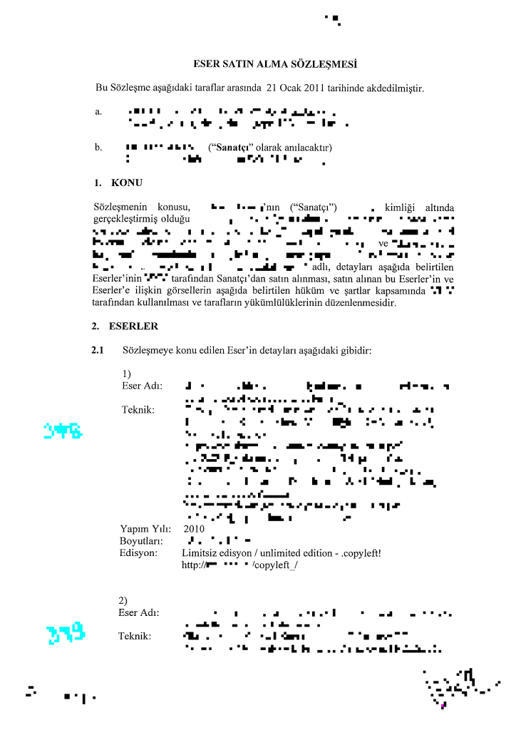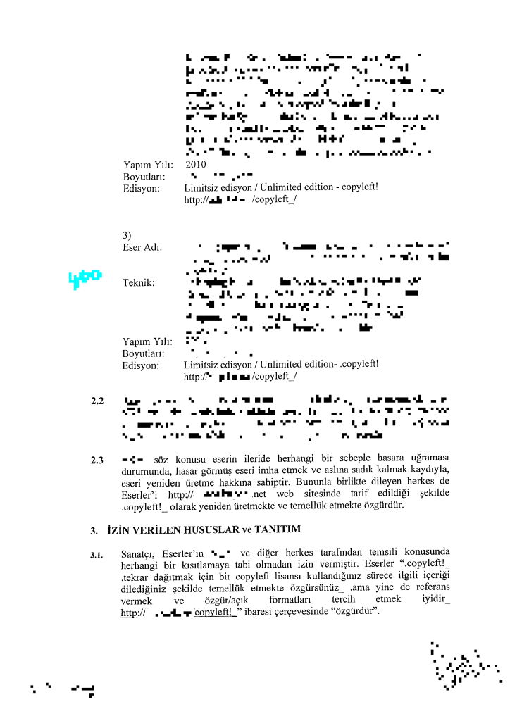 The agreement is in Turkish and this text is not a legal translation of the agreement but it features some background information as well as highlighting the modifications to the original artwork purchase agreement of the institution, to make it compatible with the copyleft attitude as declared by the Artist:
