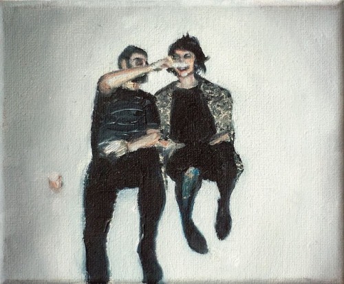 Another work shows two people sitting down. The backdrop is not visible, they are floating on a white ground, spectral presences. The man in the image has lifted up something to the woman’s face, which they both seem to be enjoying. The presence of the photographer—for, again, this is a photographic image—, as a documenter of a happy moment is now threatened by the voyeuristic presence of the viewer, accentuated by the artist’s painting this image—the presence of two people immediately insinuate a triangular dynamic with the third party, a stalking gaze that through photographing and further by painting, inserts themselves into this relationship.
