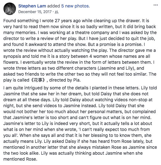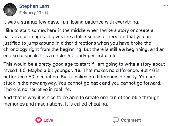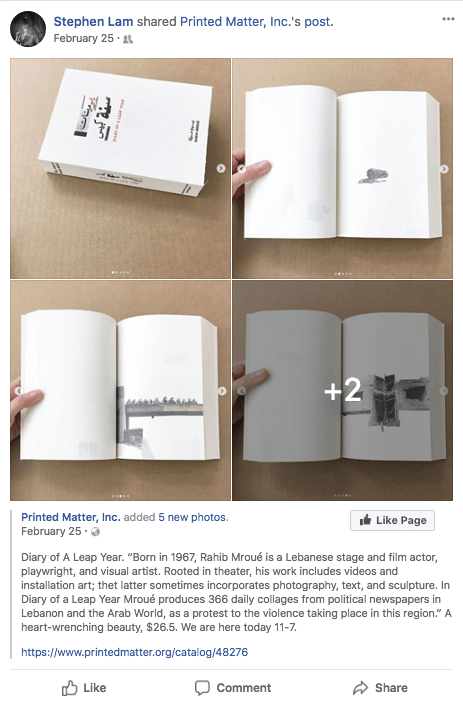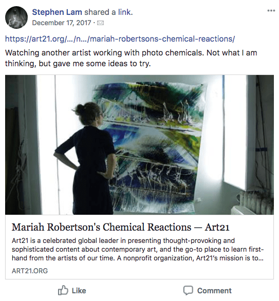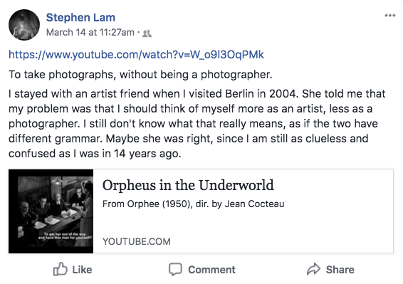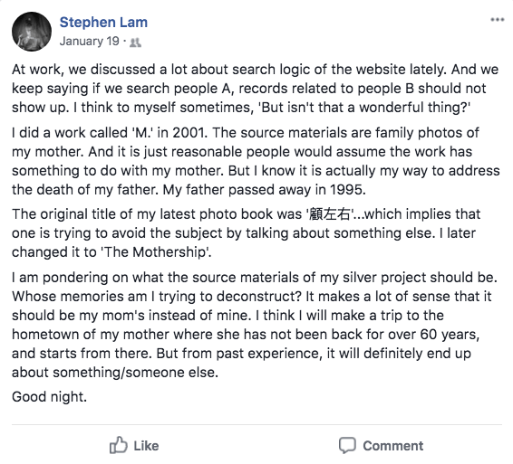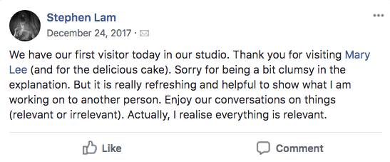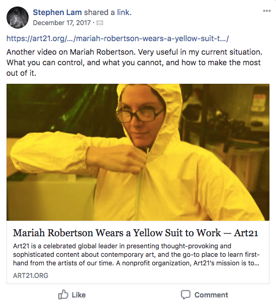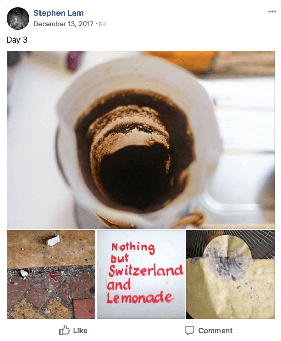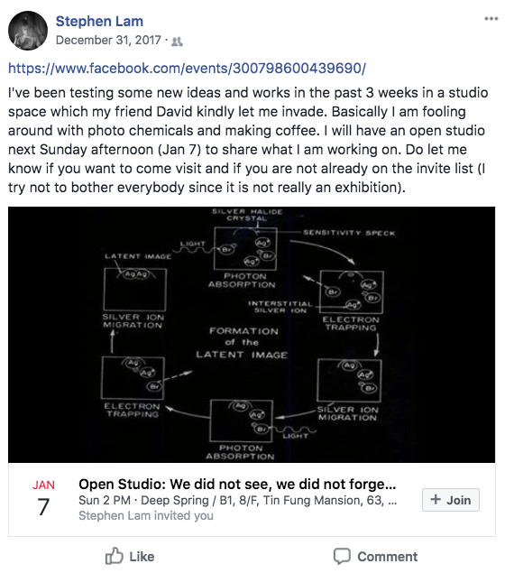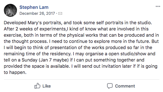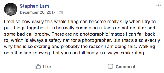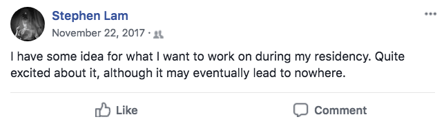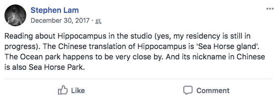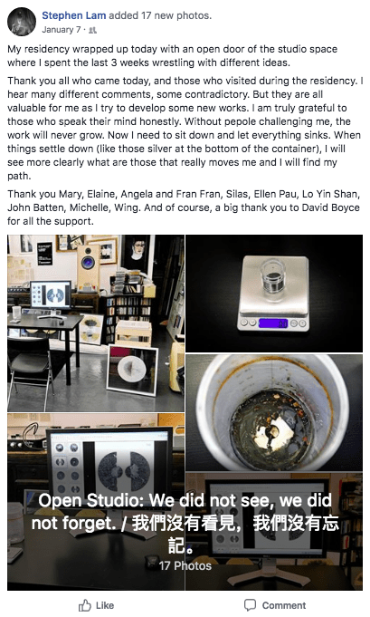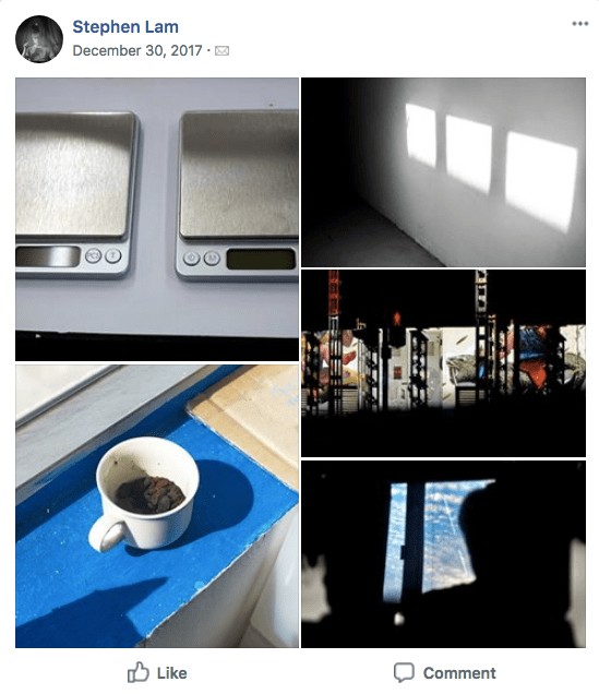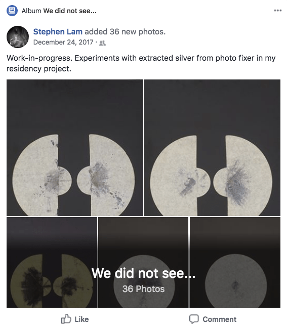 After our conversation, I kept thinking about the conditions under which Stephen created this work—how he wrote and talked about things he had to remember on a daily basis, what it means to make art without a studio space and while living with a family member who struggles to remember things. The below screenshots are taken from Stephen’s Facebook page between November 2017–March 2018, as he has been developing We did not see… This form offers something between a stream of consciousness and a guided tour. It shows how an artist takes notes on his thinking, while expressing his hesitations and doubts, to go beyond the representations of artistic personas that we have grown accustomed to.