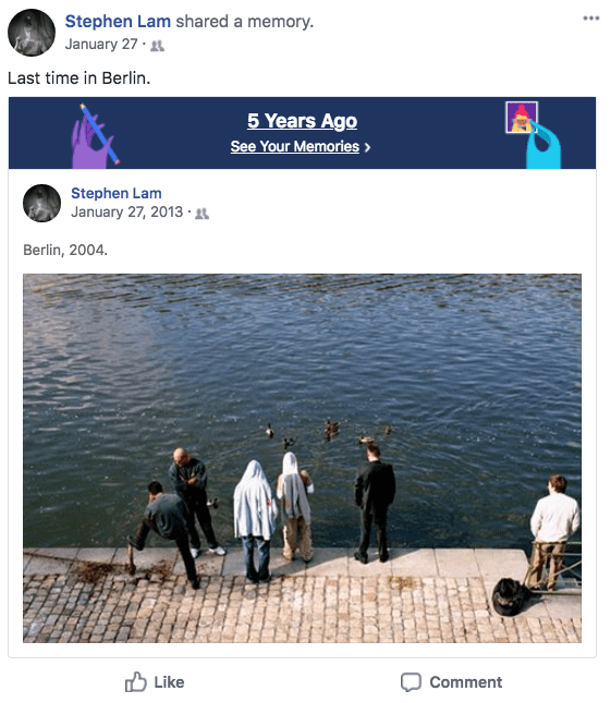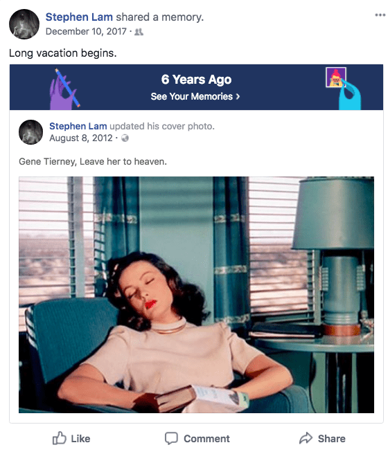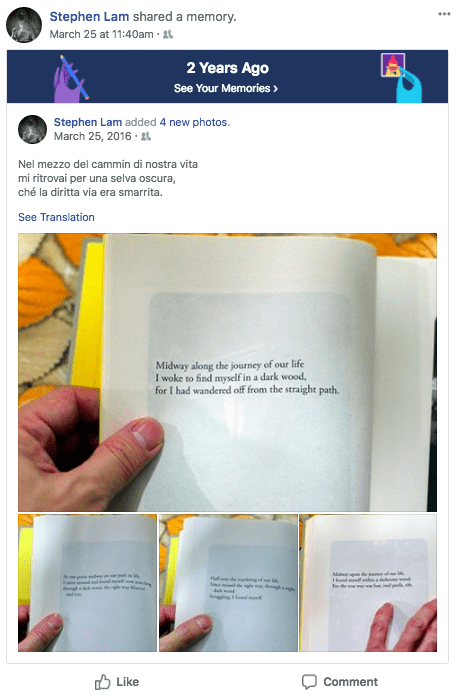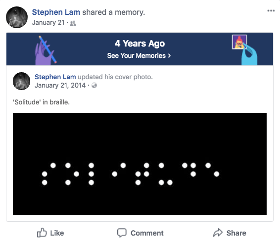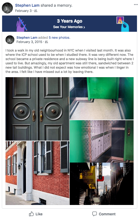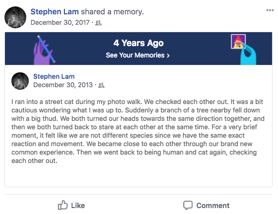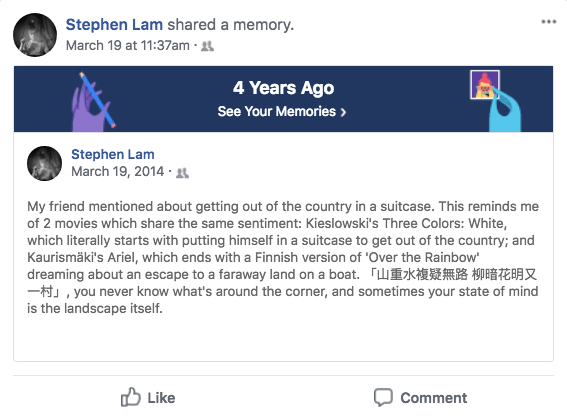 “See your memories.” Facebook reminds us all the time to look back in life. Facebook itself is a gigantic memory trove. We did not need to choose what to remember anymore. They have been tailor-chosen and pre-packaged. But I just want to turn away, and look into the distant unseen landscape.