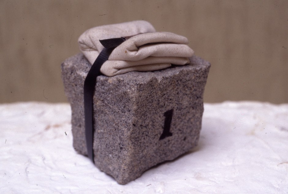 VA: Awakening, Communication Stone is reminiscent of personal traumas. My studio where we spent a lot of time together was upstairs from his apartment in Bornova, a brand new town with rows of apartment buildings erected overnight on top of farmland, grape vines in the fertile ground in the mouth of the Izmir gulf. The town was laying new cobblestones in the area. One night I picked four or five of them and brought them to my studio. They were about 10 x 10 x 10 cm cubes cut out of granite. We talked about how they were beautiful but violent objects. They sat on my shelf for a long time and one day Cengiz came up with an idea: He wanted make a “communication stone.” He wrapped one in heavy weight canvas. We stamped his initials and packed it with steel string. The object he designed was almost a sign or signifier for the way and which the society we lived in operated. There is a constant threat of danger and this violence is just sitting there, ready to become a perpetration at a moment’s notice.