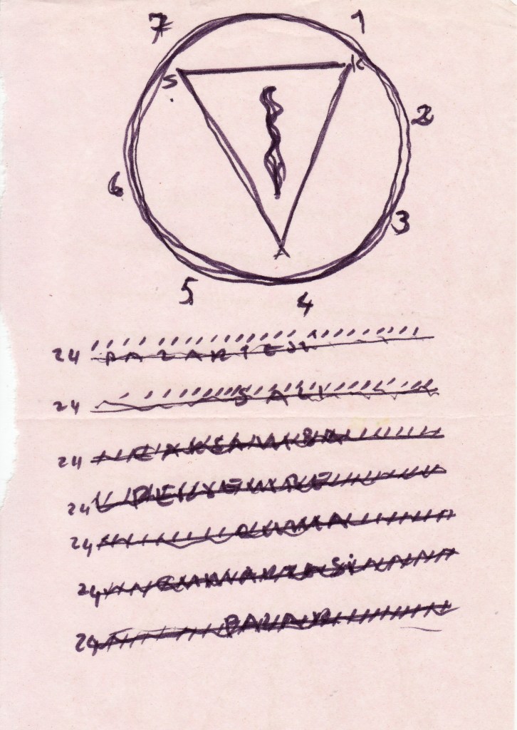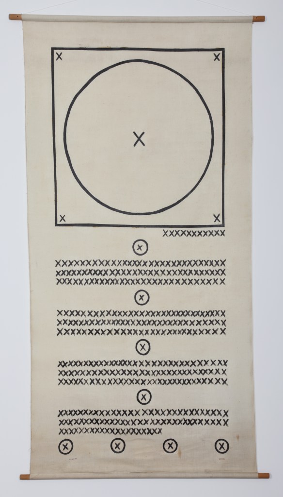 For instance, Cengiz uses healers’ strategies in Yaşanmış Bir Yılın Takvimi (Calendar of a Year Lived) from 1977. Again using fume as a painting material, the artist methodologically marks the days with crosses on a piece of fabric—there are no numbers or words on this calendar, but just the marks of days past. There he uses wax and paint on a canvas rolled like a traditional wall calendar to create a logo with the letter A and M, which means vagina in Turkish (am). He talked about being influenced by the book he read early on about Anadolu Büyüleri (Anatolian Spells) and Cinsel Büyüler (Sexual Spells) by İsmet Zeki Eyüboğlu [3].