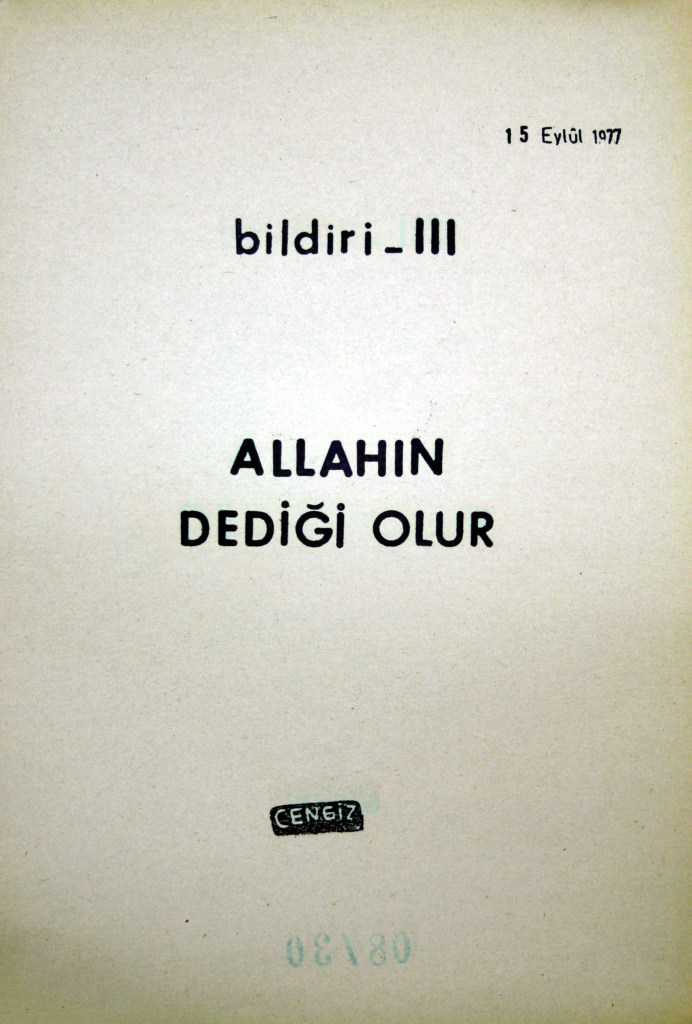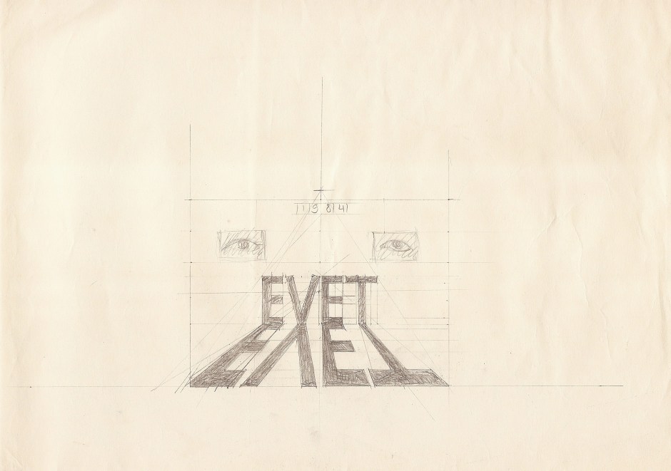 VA: I don’t think Cengiz was a visual thinker as much an analytical thinker. Concepts and words triggered his mind. I think “bedava” was not interesting to him as a typographical gesture but as a social concept. We may never know this with certainty as he never realized this project, but I know how he made the Evet (“yes” in Turkish) paintings in 1985. In that project, he was talking about two concepts: one, the state’s brutality and agenda to censor, oppress, and watch individuals after the military coup and two, individuals’ helplessness under the totalitarian regime. He talked about how people say “yes” to everything the state dictates under torture. In those paintings, he simply combined these two concepts using commercial sign paintings, with a play in perspective and using color theories. During the making of the work, typically for a long period of time, he would focus on a single concept, which was a generative process for him. The Evet paintings also employed the flatness of miniatures and used the iconography and tradition of Alevi “word pictures” (yazı resim) [1].