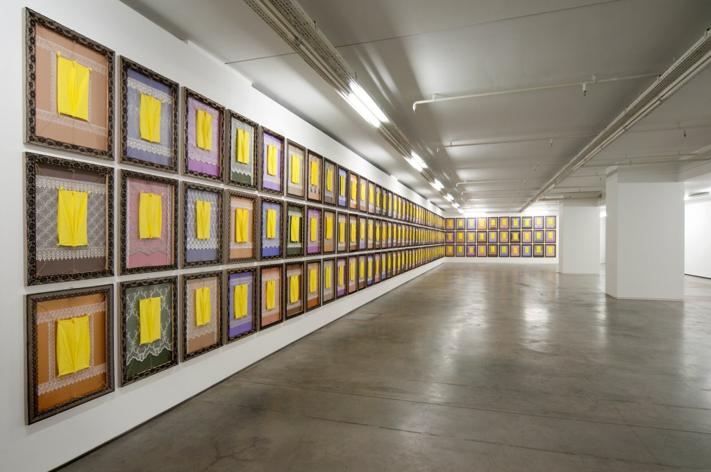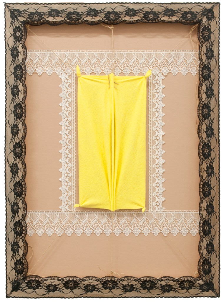 MÜ: I want to continue with Temizlik Bezi İle (With a Cleaning Cloth) from 2013, a 144-piece installation made up of 81 x 60 cm framed canvases with their backs facing the viewer. Çekil repeated the same form on each piece, stretching a generic bright yellow cleaning cloth using string, attached to the four corners of the frame so that the curves of the cleaning cloths look like the outlines of the female genitalia. Different colors were used for the background, in what the artist has stated to signify the stages of a bruise. Also included in the compositions are different types of lace, which frame both the cleaning cloths and covers the frames. This work was heavily criticized by several women artists for having a male-oriented perspective on violence and the female body. Çekil was hesitant when starting this project. I remember him saying that he wanted to make sure the work was not just about the “fantasies of a middle-aged man” [4]. He spent a lot of time figuring out the materials and the format.