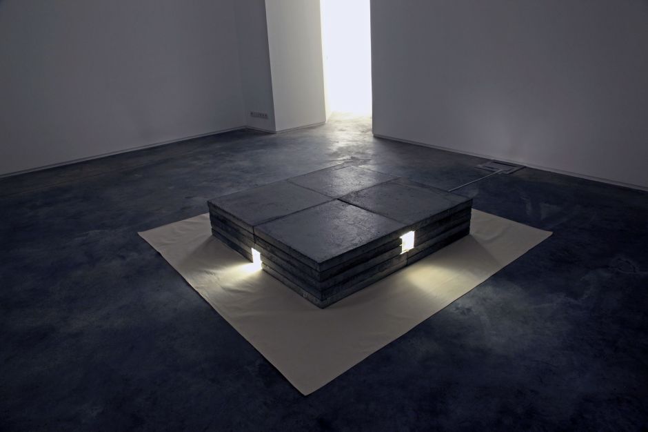 MÜ: Energy, resistance, and human resilience are paramount for many of Çekil’s works. I was recently thinking about Uyandırma, İletişim Taşı (Awakening, Communication Stone) from 1987 and I was struck by the latent energy of this work—a stone that can be violent, stagnant as an object, standing in for that very simple yet invasive act of violence, throwing a stone through somebody’s window. In Turkey, the stone thrown at the window serves as a “warning.” In Saklı Işık (Clandestine Light) also from 1987, construction supplies, fluorescent lights, electrical cables, and cerecloth are used to create a geometric sculpture lit from within. It also has this ominous quality, delineating the outside from the inside, creating a space that we can only access through the emanated light, set up on a piece of cerecloth. Cerecloth formally connects these works, but I also suspect there is something about the resilience through distilling life-threatening events into these anti-monuments. Through these commonplace objects and minimal compositions, Çekil appears to merely point to trauma, both personal and social, creating iconographies that are very bare-bone.