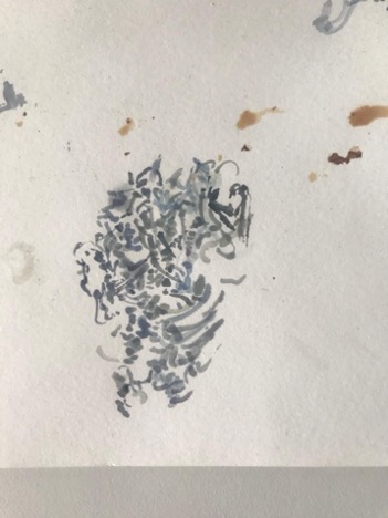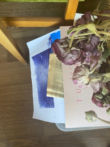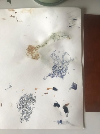 After having used the water like paint, I placed a sheet of paper in the flower’s water. Then I placed that sheet on top of the drawing, the image. I squeezed the water out.