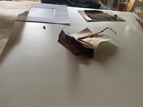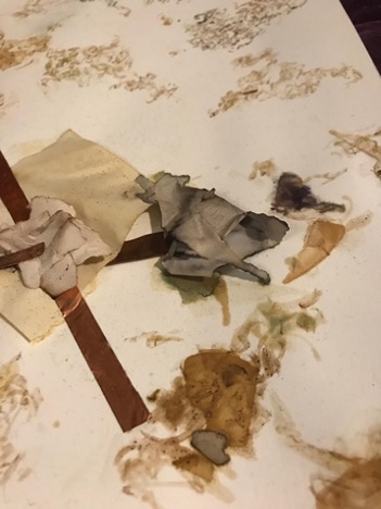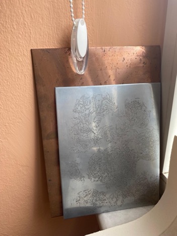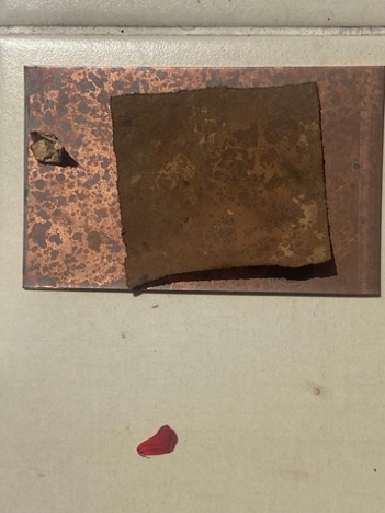 The piece of paper that had dried on the oxidized copper sheet like a mark, the dried paper that has soaked in all the water.
