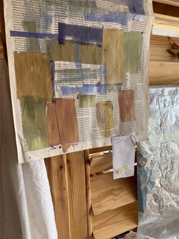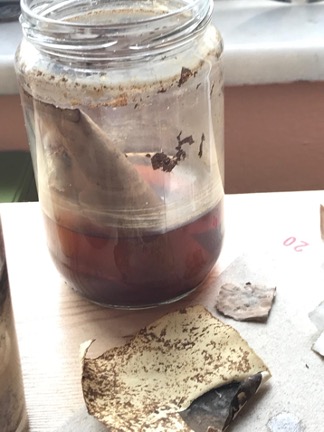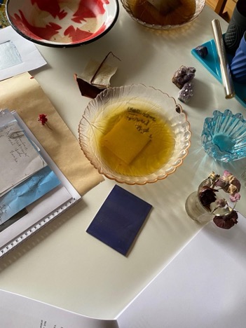 I placed the paper vertically in a jar for the first time. A slight shift can be so transformative for the mind… I had always left the sheets of paper flat in soup plates, letting the paper be soaked in the water of the plants that I had been boiling