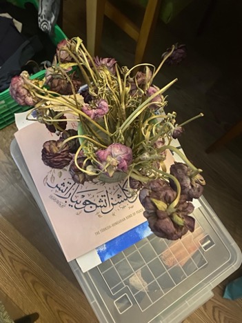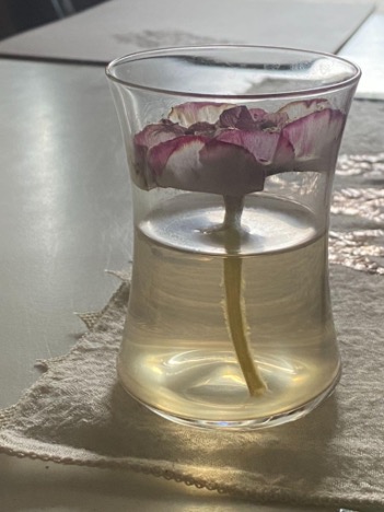 I’m returning to the place where I was when I began to correspond with you and Özge, which I had then shared with you, when I watched the flower that I had dried bleed its color into the water where I had placed it vertically, changing color.