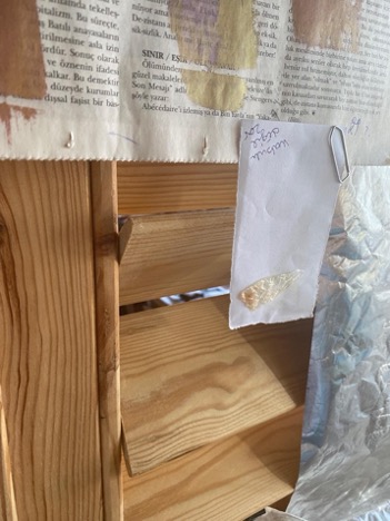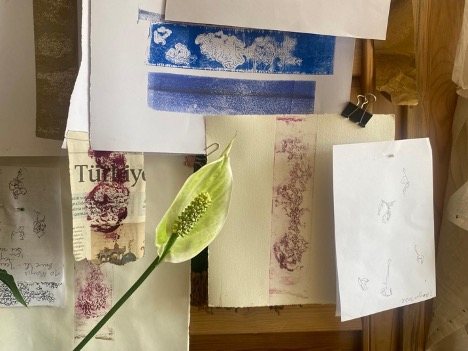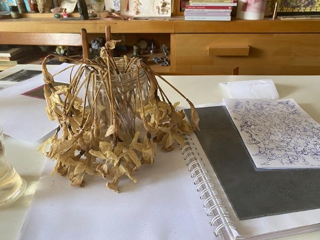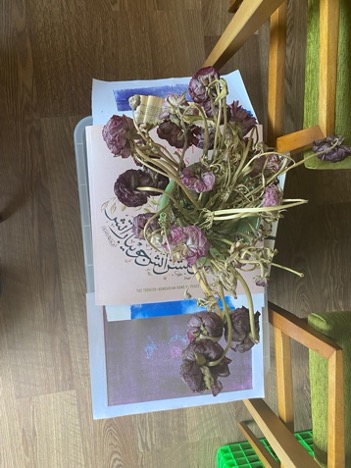 The old newspapers and the leaves go between Ayşe Şasa’s book, which then go inside another book. On top are the peonies, dried, with their necks bent.