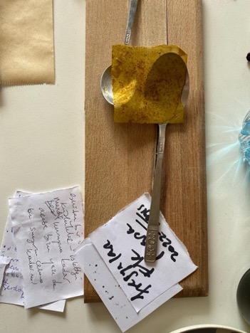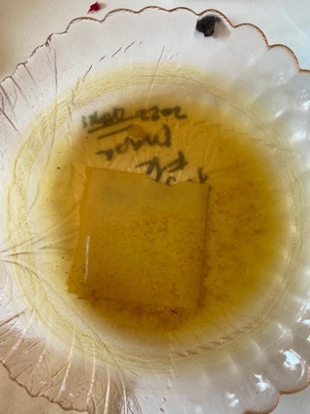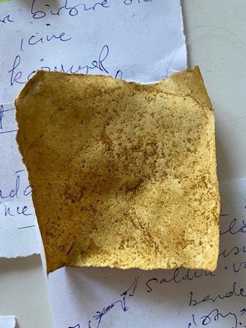 A sheet of paper immersed in this very yellow water, sitting in a household plate. We don’t know how it would dry, would it remain that very yellow? Next to it on the table is the purple-blue-silver linoleum sheet, in the size of the sheet of paper in the water -close to it-