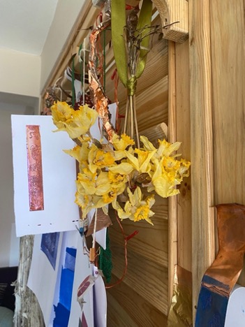 The bouquet at home is hanging on the divider. As I meandered up and down in the text, I tied the narcissus looking up with the ones looking down, tying them together with the ones at home.