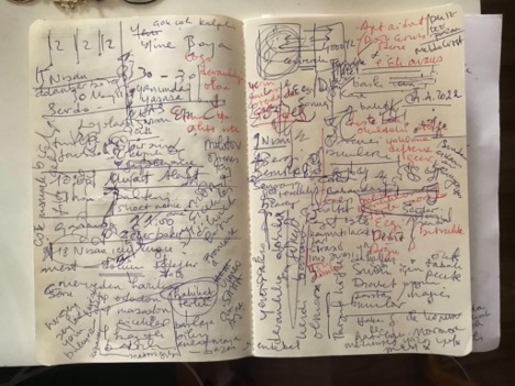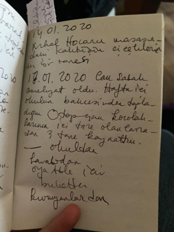 When their study session with Aral was done, she came over to me and said that she had brought me a notebook. Her father was working at the printing house. And they made notebooks as well. I asked her which printing house it was and when she said, they were located in Bağcılar, I asked whether it was the Barıns’. Emir Barın had mentioned it. She answered saying that yes, it was indeed there where her father worked. A notebook with a green cover. We appreciate notebooks.