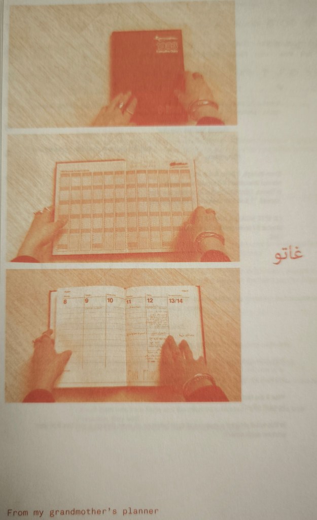 While the days are cast into the figures of ruling history, with landmark events conquering the minutiae of time for its subjects, these recipes measure things in handfuls, mouthfuls, and spoonfuls. The handwritten words of the recipes, embodying their measurements, rise against the rigid lines of mechanical letters. The projected timeline of the planner is disrupted by the elegant, twisted handwriting that conveys the taste of the mother tongue. The Arabic letters cast a spell on the colonizing power of English, occupying its rules and sound foundations.