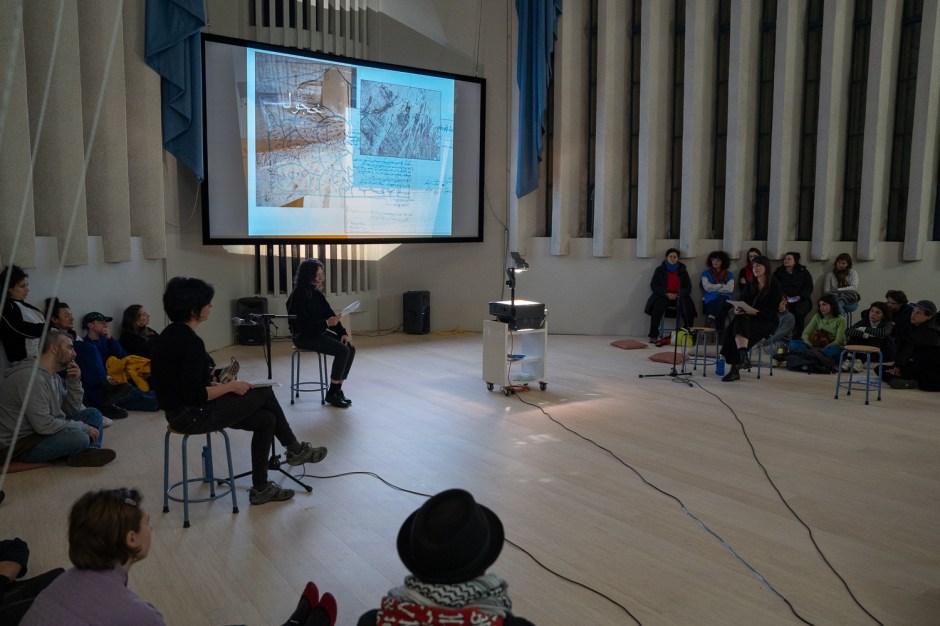 This tension is also central to Still in My Quotidian, the lecture performance at de Appel, which meditates on the presence of a tactile and homegrown language in absentia, tainting the intended meanings in an acquired second language. The performance unfolds beneath the dome-like structure of de Appel, with the performers surrounded by the audience. Some of us sit on pillows on the ground, others perch on chairs. In this semicircular setting, we observe not only the performers but also the audience across. There is no stage—no architectural element physically separating performers from spectators. We all share the same ground, heightening the sense of a common experience that feels intimately familiar to each of us in some way. Our gaze moves seamlessly between the performers and the audience; at least in the beginning, no firm divide exists between us. I sit in a chair, having agreed to livestream the performance for Hanieh, who was unable to be present at the performance due to visa issues. I hold the camera in my hand and try to remain still.