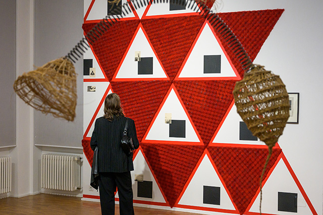 (Foreground) İz Öztat, Circle of Eternal Return (After Zişan), 2013 / From the series Posthumous Production. Vegetable fibers, spring, thread, 120 × 80 × 80 cm.